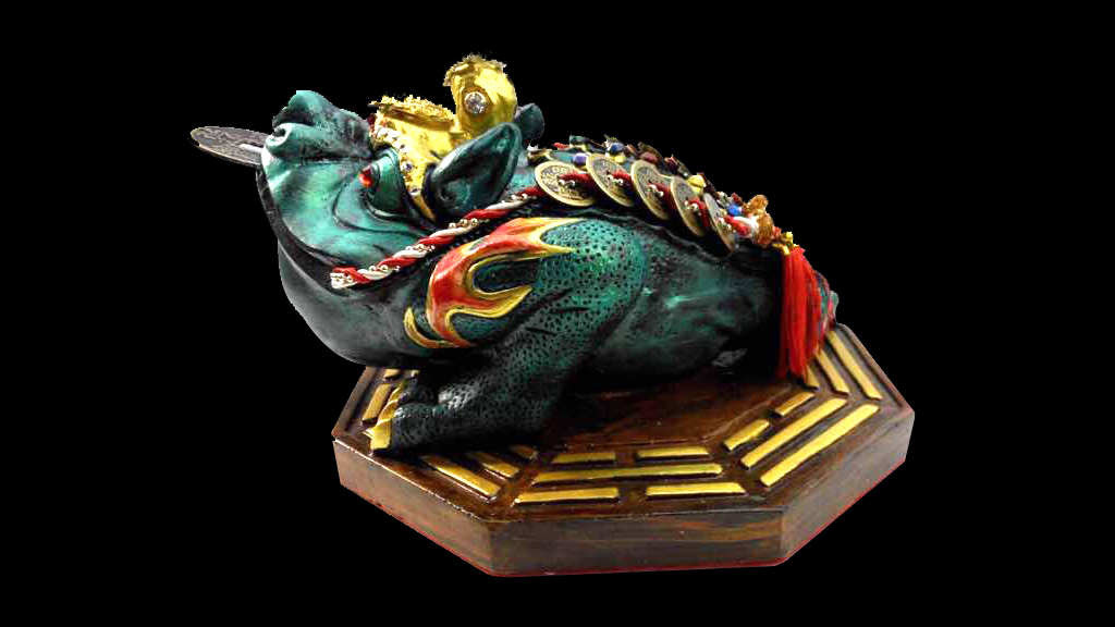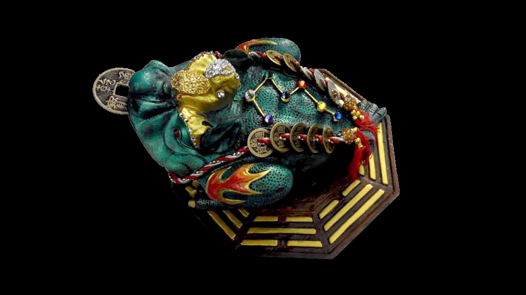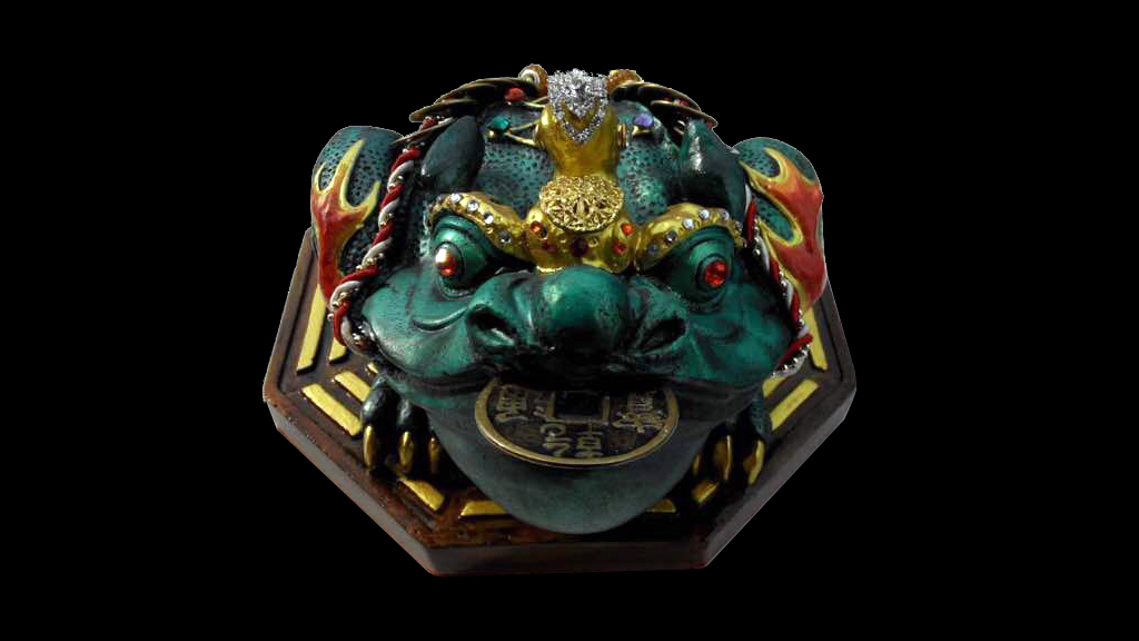 俗称金蟾,这只丰满肥硕,背负钱串且口含方孔钱的三足青蛙,带有吐宝发财,只进不出,进财而不漏的寓意。这只由兴师傅按照纳西族东巴文化的图腾亲自操刀所设计且经由其独门的龙血开光法门开示的招财蛙,匍匐在八卦盘上,借着其所吸收的地气,协助结缘者聚拢财气。嘴大吃四方的招财蛙,肚大容万贯家财,身沉稳坐江山;此外,招财蛙也能吸灵辟邪,放在家中可镇宅化煞,守护家人。此外,招财蛙底座封存人缘膏、黑木王 (Kayu Raja),以及具有消灾避祸之效的灵符,可用以改善结缘者的运势磁场,提升其人气和财气。